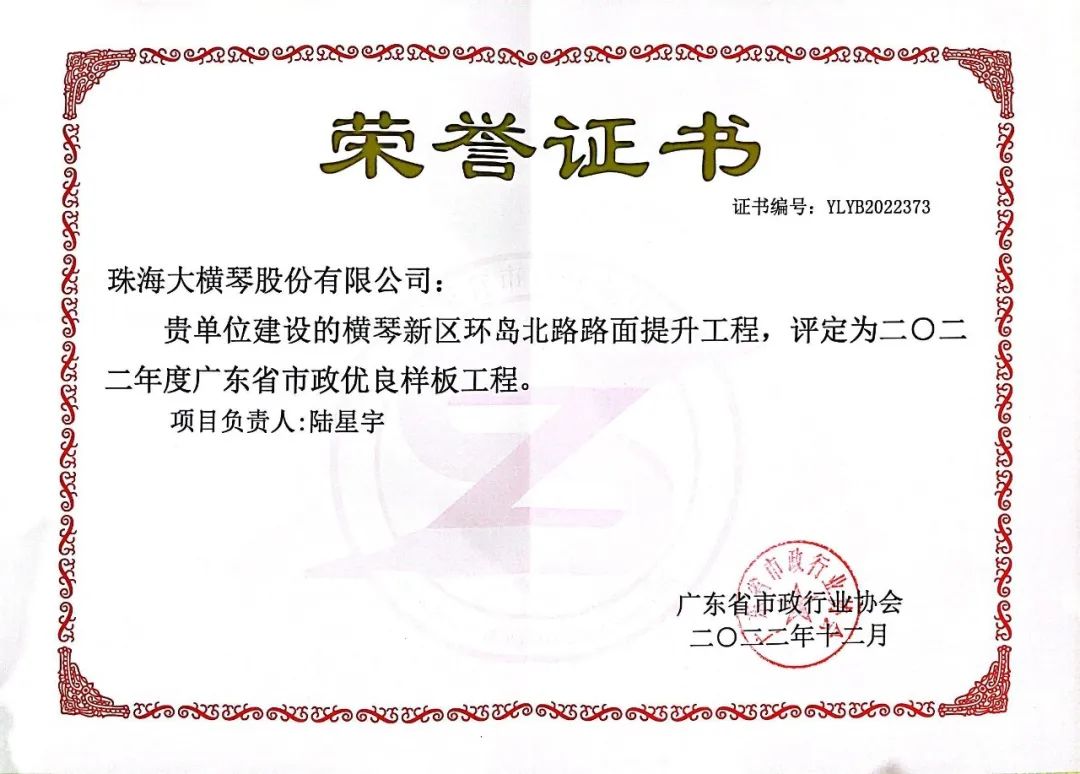 喜訊 | 橫琴環(huán)島北路路面提升工程獲評2022年度廣東省市政優(yōu)良樣板工程