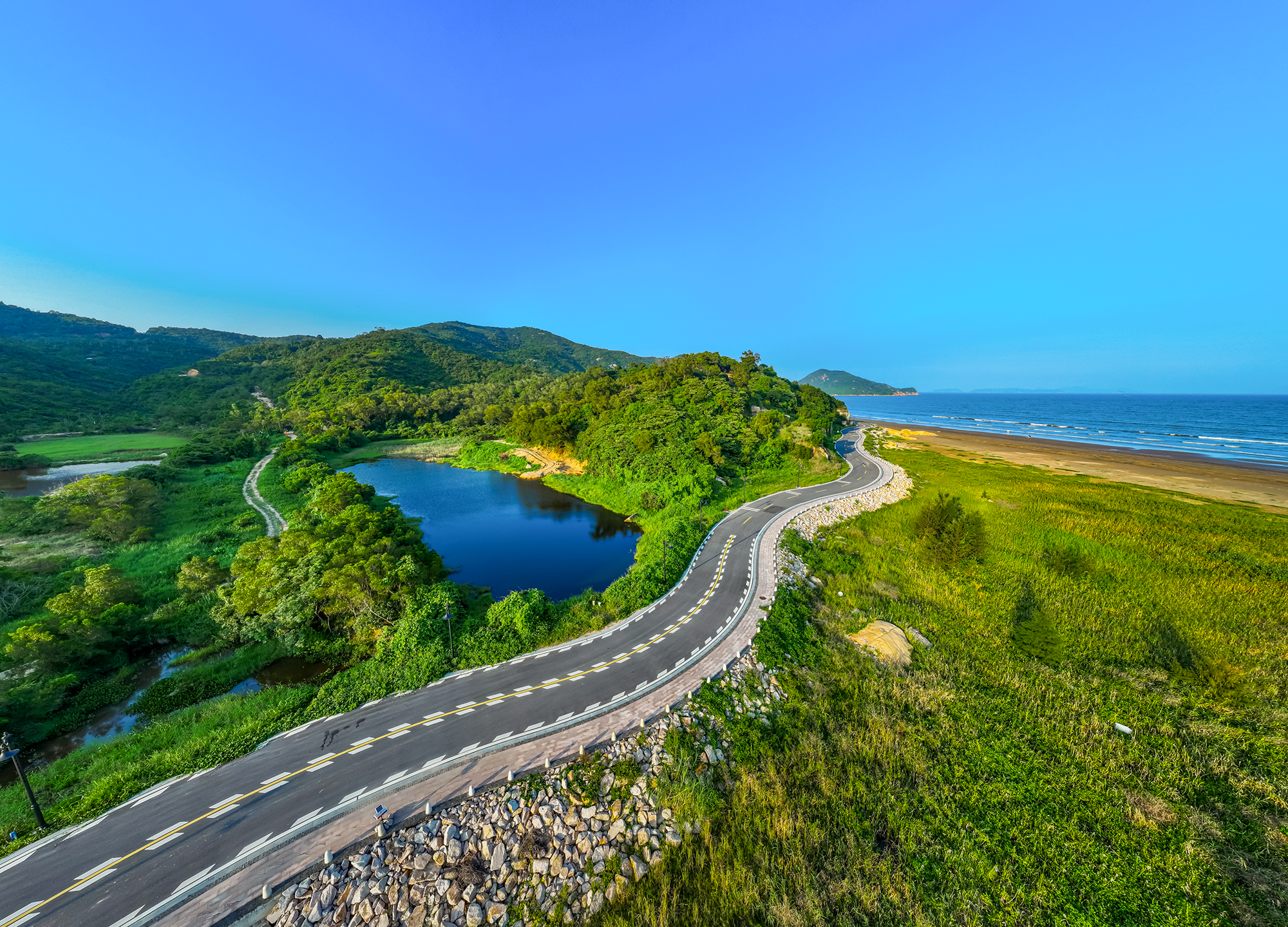 項目具有獨具一格的自然風(fēng)貌,在設計方面拋開(kāi)固有市政道路設計形態(tài),采用人車(chē)分離,將慢行系統融入景觀(guān),打造濱海旅游休閑帶。其中沙灘總面積約63萬(wàn)平方米,瀉湖總面積約18萬(wàn)平方米,綠洲面積約37萬(wàn)平方米。罕見(jiàn)的濱海瀉湖草甸景觀(guān),讓環(huán)島南路成為橫琴不可多得的絕美濱海景觀(guān)路。